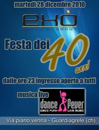 Condividi su: martedì 28 dicembre alle ore 23.00 - 29 dicembre alle ore 3.00 festa dei quarantenni!!! dalle 23:00 in poi ingresso aperto a tutti!!!! Musica live By dance fever Exò disco Glamour via piano venna Guardiagrele, Italy Condividi su: