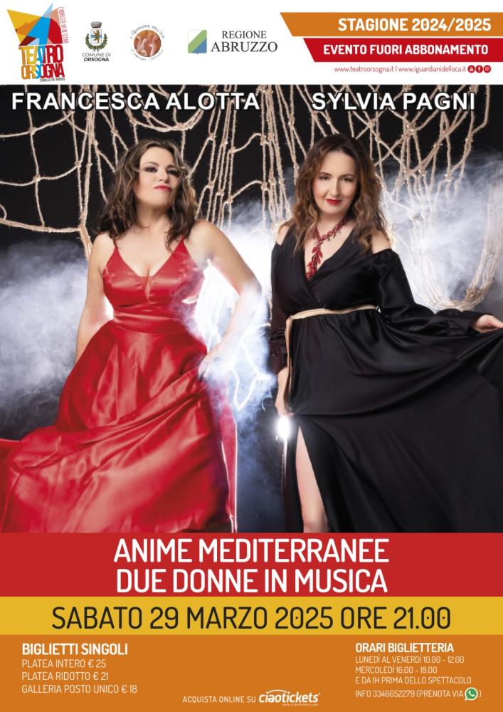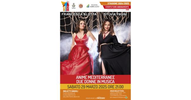 A chiusura della stagione di prosa 2024/2025, la prima nazionale de “Anime Mediterranee due donne in musica” con Francesca Alotta e Sylvia Pagni. Il 29 marzo alle ore 21.00 presso il Teatro Comunale “Camillo De Nardis” di Orsogna,  queste due prestigiose musiciste, portano in scena uno spettacolo unico e coinvolgente; un viaggio attraverso la storia e la musica del Mediterraneo.