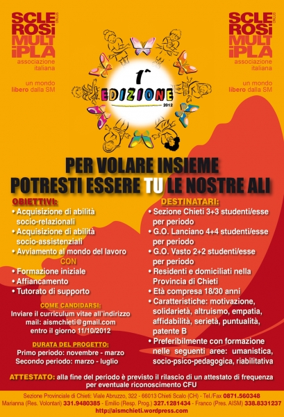 Quest’anno, per la prima volta nella Provincia di Chieti, si avvierà il progetto “Insieme per volare”. In tal modo, l’AISM darà risposta alle esigenze e ai bisogni dei propri Soci (le persone con SM) e ai tanti interrogativi dei giovani universitari, che hanno curiosità intellettiva e spirito di solidarietà. Oggi, i giovani desiderano sempre più mettersi in gioco, per poter sperimentare sul campo i propri saperi e conoscenze: in AISM troveranno l’unica realtà d’Italia impegnata per “un mondo libero dalla SM” sin dal 1968. Destinatari del progetto sono complessivamente 18 giovani studenti universitari, residenti o domiciliati nella Provincia di Chieti, con età compresa tra i 18 e i 30 anni, preferibilmente con formazione nelle seguenti aree: umanistica, socio-psico-pedagogica e riabilitativa. Quindi, tutti gli studenti degli altri corsi di laurea possono ugualmente partecipare. L’unico requisito imprescindibile è il possesso della patente di categoria B. Il motivo per cui ci stiamo rivolgendo agli studenti universitari, risiede nella nostra disponibilità a certificare giorni e ore di presenza, oltreché obiettivi conseguiti dei Volontari, cosicché essi potranno, successivamente, richiedere il riconoscimento per ottenere CFU.