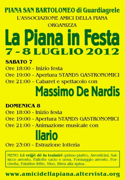 E’ arrivata ormai l’estate e con essa le feste e le sagre che ogni anno ci danno appuntamento. L’associazione “Amici della Piana” organizza per Sabato 7 e Domenica 8 Luglio “La Piana in festa”.