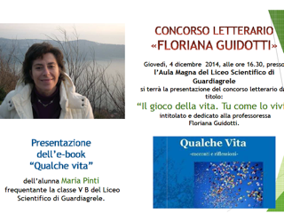 Ad intervenire successivamente è stata la Professoressa Mara Di Nardo che ha portato un caro saluto ai familiari della Guidotti e alle istituzioni presenti, ed ha ricordato commossa le virtù della sua “amica e collega” Floriana. La Professoressa Elsa Flacco ha quindi presentato il bando della prima edizione del concorso letterario “Il gioco della vita. Tu come lo vivi?” indirizzato a tutti gli studenti delle scuole superiori di secondo grado della città di Guardiagrele e dalle prossime edizioni aperto anche agli alunni di altre scuole superiori. Il concorso è strutturato in tre diverse sezioni: narrativa, poesia e articolo di giornale e i premi in palio per i vincitori delle tre categorie sono rispettivamente un quadro dell’artista Antonio Spinogatti, testi scolastici per l’a.s. 2015/16 e un tablet. E’ possibile inviare gli elaborati entro il 31 marzo 2015 ed entro il 4 maggio saranno scelte le opere vincitrici e giudicate in base alla rispondenza del tema, l’originalità e l’efficacia del messaggio. Il bando completo del concorso è pubblicato sul sito dell’Istituto.