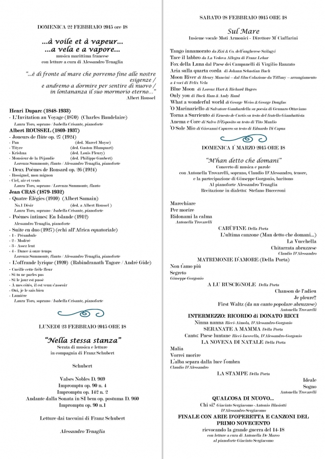 In programma romanze di Francesco Paolo Tosti ed altre romanze tra le quali Ninna nanna e Paese luntane dei guardiesi Donato Ricci - Aldo Aimola e Mauro Iacovella.