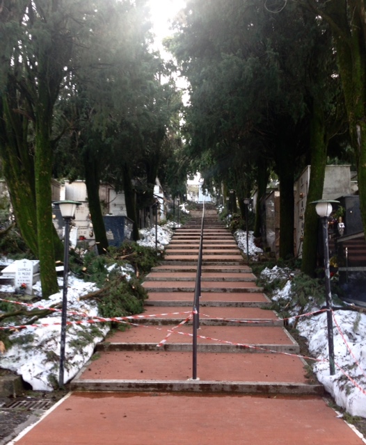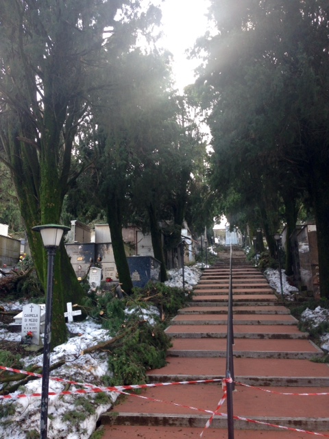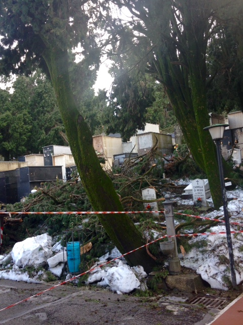 Non si sa ancora quando sarà ripristinata la situazione. Gli operai sono al lavoro già da due giorni e stanno cercando di liberare tutti gli stradoni del cimitero dalle piante e dagli alberi caduti. Si sta provvedendo anche alla potatura dei rami spezzati dalla forza della natura e rimasti in stato pericolante sugli alberi.