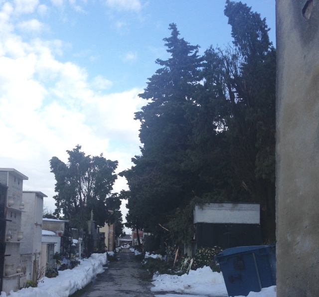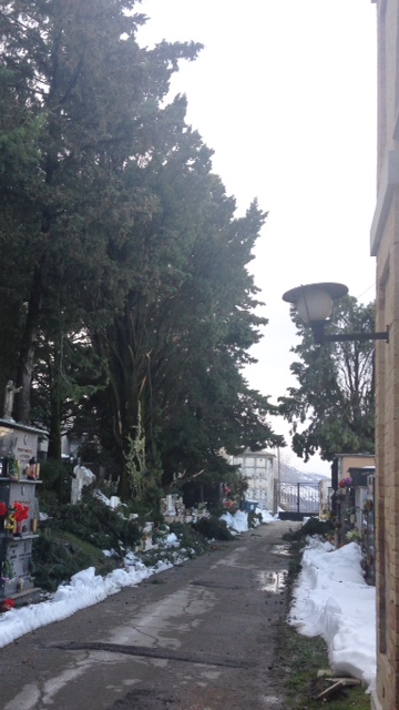 Il cimitero di Guardiagrele è stato disastrato dall’abbondantissima nevicata del 5 marzo. Il peso della neve e il vento hanno causato la caduta di tantissimi alberi e rami, provocando anche danni ad alcune tombe.