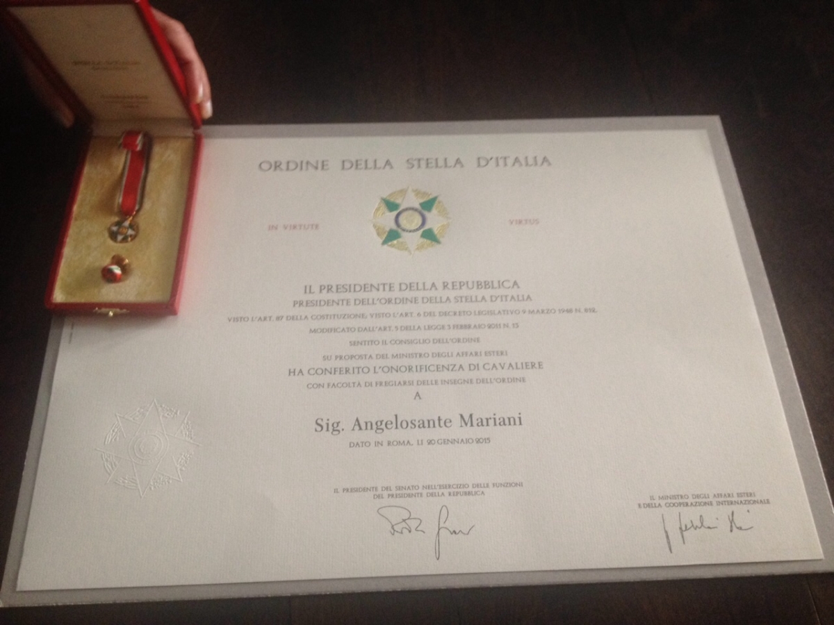 Pertanto il 3 giugno 2015, la Repubblica Italiana, nella persona del Presidente, gli ha conferito postumo l’onorificenza di Cavaliere dell' Ordine della Stella d'Italia (già Stella della Solidarietà Italiana), per ricompensare la sua dedizione nell’aiutare le persone bisognose in patria e all’estero, per le sue benemerenze nella promozione dei rapporti di amicizia e collaborazione tra l'Italia e l'Argentina, e nella promozione dei legami con l'Italia.