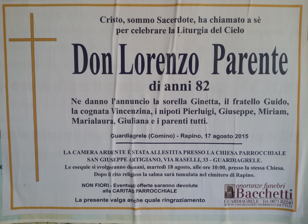 "L'Amministrazione Comunale partecipa al lutto per la morte di don Lorenzo Parente, prete negli anni fecondi del postconcilio, presente nella vita cittadina sia come pastore attento, rigoroso e paterno della Parrocchia San Giuseppe Artigiano sin dalla sua fondazione sia come docente nella scuola dell' obbligo.
