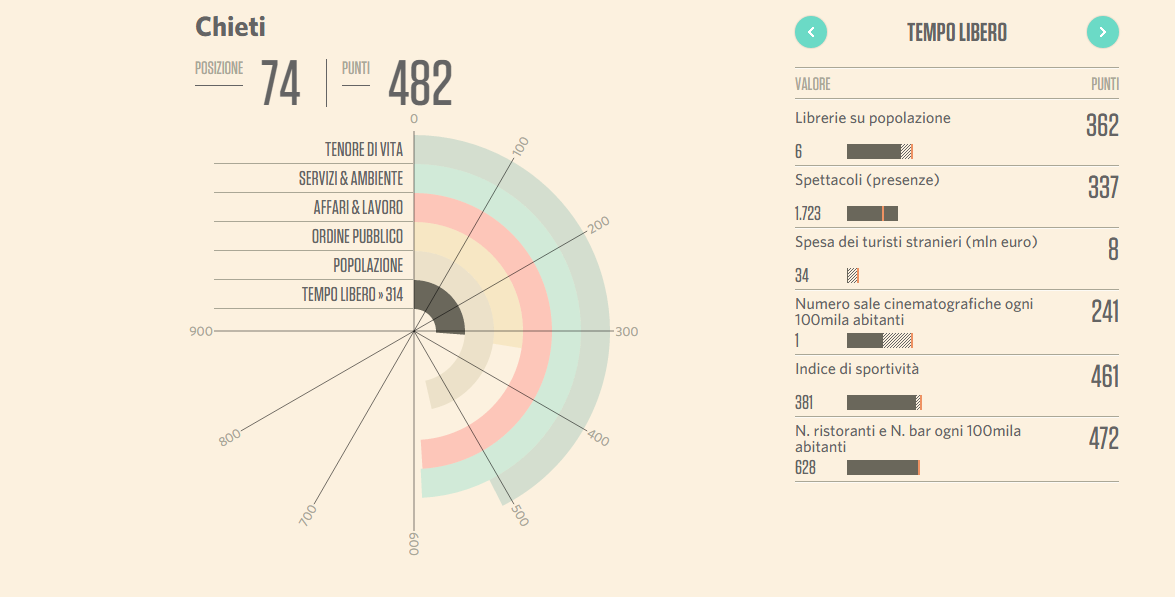 Meglio nelle sezioni Tenore di vita e Servizi e Ambiente ma ancora molto indietro il settore Tempo libero dove a fare da contrappeso ai 560 bar e ristoranti per ogni 100mila abitanti ci sono le appena 4 librerie e tre sale cinematografiche.