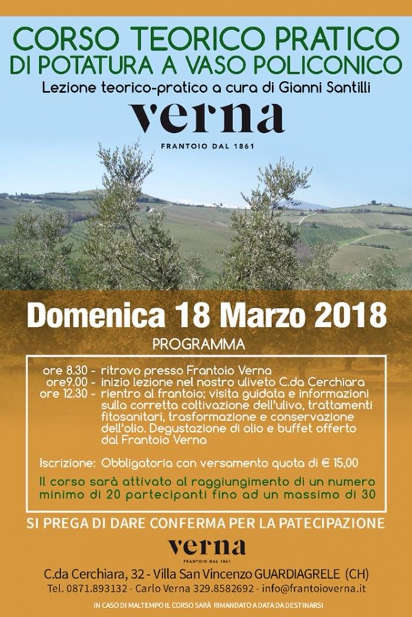 Lezione teorico- pratico di potatura a vaso policonico organizzato dal Frantoio Oleario Verna in collaborazione con l'esperto Gianni Santilli, domenica 18 Marzo alle ore 8.30 presso il frantoio Verna in via cerchiara, 32, Villa San Vincenzo di Guardiagrele.