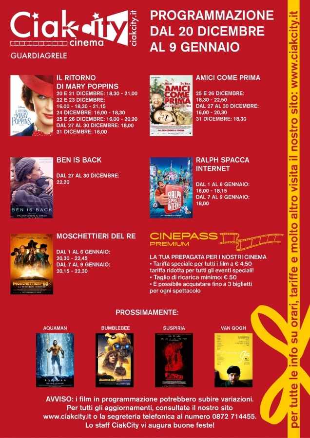 Il Ciak City cinema di Guardiagrele accompagnerà le nostre festività natalizie con la proiezione di una serie di film da non perdere.