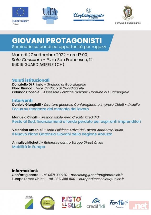 Si terrà martedì 27 settembre, alle ore 17, presso la sala consiliare del Comune di Guardiagrele il Seminario dal titolo “GIOVANI PROTAGONISTI: Seminario su bandi ed opportunità per ragazzi” organizzato da Confartigianato in collaborazione con il Comune di Guardiagrele.