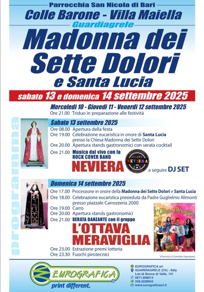 Sabato 13 e domenica 14 settembre 2025 la comunità di Colle Barone – Villa Maiella (Guardiagrele) celebra la tradizionale festa della Madonna dei Sette Dolori e di Santa Lucia, un appuntamento molto sentito che unisce fede, musica dal vivo, gastronomia e tradizione popolare.