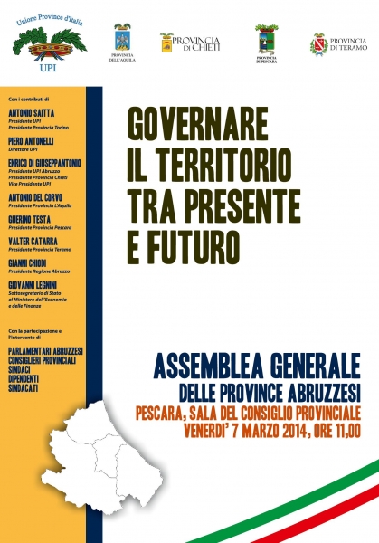 "Governare il territorio tra presente e futuro". E' questo il tema dell'Assemblea generale delle Province Abruzzesi, che si terrà venerdì 7 marzo prossimo alle 11 a Pescara, nella Sala del Consiglio provinciale, promossa e convocata dal Presidente dell'Unione delle Province Abruzzesi e Vice Presidente nazionale dell'Unione Province d'Italia, Enrico Di Giuseppantonio, che presenta così l’iniziativa: “E’ un momento di confronto approfondito che si rende necessario visto il perdurante stato di incertezza sulle sorti delle Province Italiane. Al di là di ogni inutile polemica, quello che ci preme è che il percorso porti davvero a una riforma costituzionale del Titolo V organica e ragionevole, incisiva sull’assetto generale della Pubblica Amministrazione. Con il Presidente dell’Unione delle Province d’Italia, Antonio Saitta, faremo il punto sulla situazione”.
